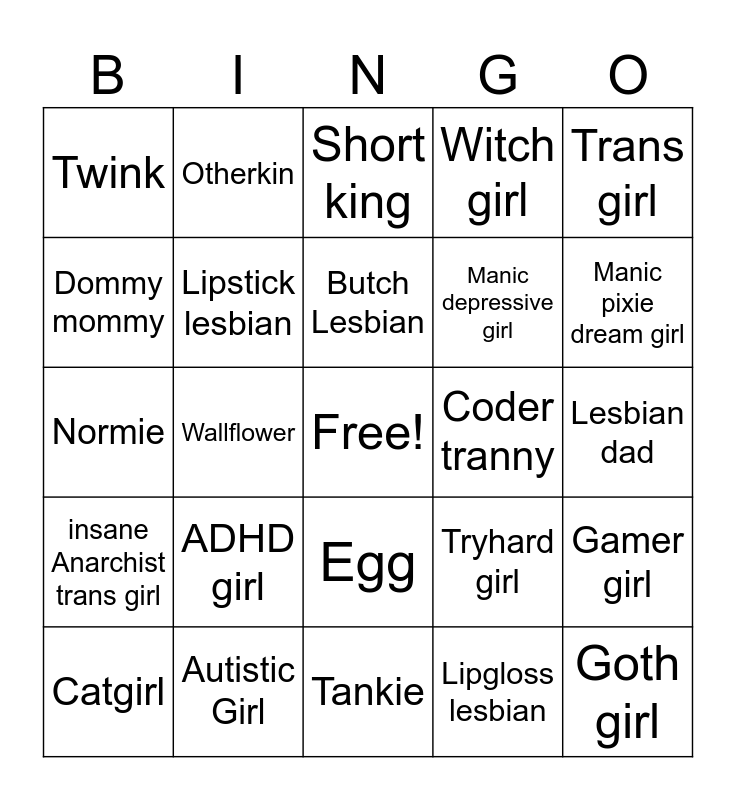 This bingo card has a free space and 24 words: ADHD girl, Autistic Girl, Butch Lesbian, Catgirl, Trans girl, Twink, Dommy mommy, Otherkin, Coder tranny, Egg, Manic depressive girl, Normie, Tryhard girl, Gamer girl, Lipstick lesbian, Lipgloss lesbian, Lesbian dad, Short king, Manic pixie dream girl, Wallflower, Goth girl, insane Anarchist trans girl, Witch girl and Tankie.