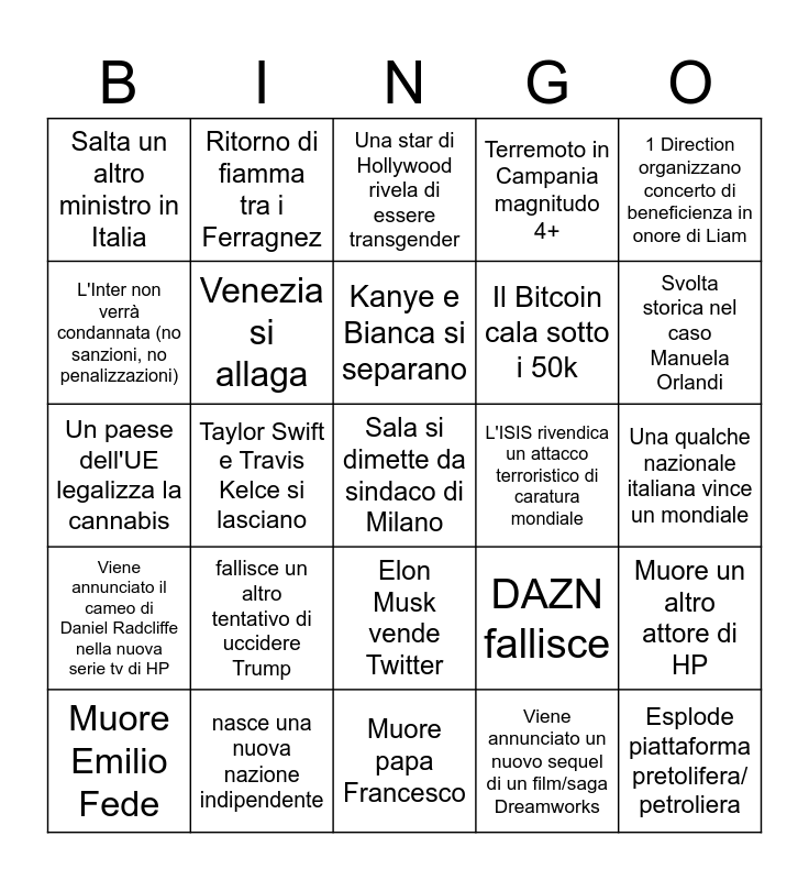 This bingo card has a free space and 24 words: fallisce un altro tentativo di uccidere Trump, nasce una nuova nazione indipendente, Kanye e Bianca si separano, Muore Emilio Fede, 1 Direction organizzano concerto di beneficienza in onore di Liam, Salta un altro ministro in Italia, L'Inter non verrà condannata (no sanzioni, no penalizzazioni), Ritorno di fiamma tra i Ferragnez, L'ISIS rivendica un attacco terroristico di caratura mondiale, Elon Musk vende Twitter, Il Bitcoin cala sotto i 50k, Un paese dell'UE legalizza la cannabis, DAZN fallisce, Muore un altro attore di HP, Venezia si allaga, Viene annunciato un nuovo sequel di un film/saga Dreamworks, Una qualche nazionale italiana vince un mondiale, Una star di Hollywood rivela di essere transgender, Svolta storica nel caso Manuela Orlandi, Taylor Swift e Travis Kelce si lasciano, Esplode piattaforma pretolifera/ petroliera, Viene annunciato il cameo di Daniel Radcliffe nella nuova serie tv di HP, Terremoto in Campania magnitudo 4+ and Muore papa Francesco.