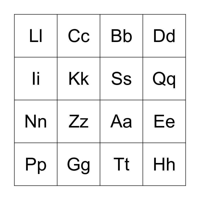 This bingo card has a free space and 15 words: Pp, Hh, Bb, Ll, Qq, Ii, Zz, Tt, Kk, Nn, Ee, Dd, Ss, Cc and Gg.