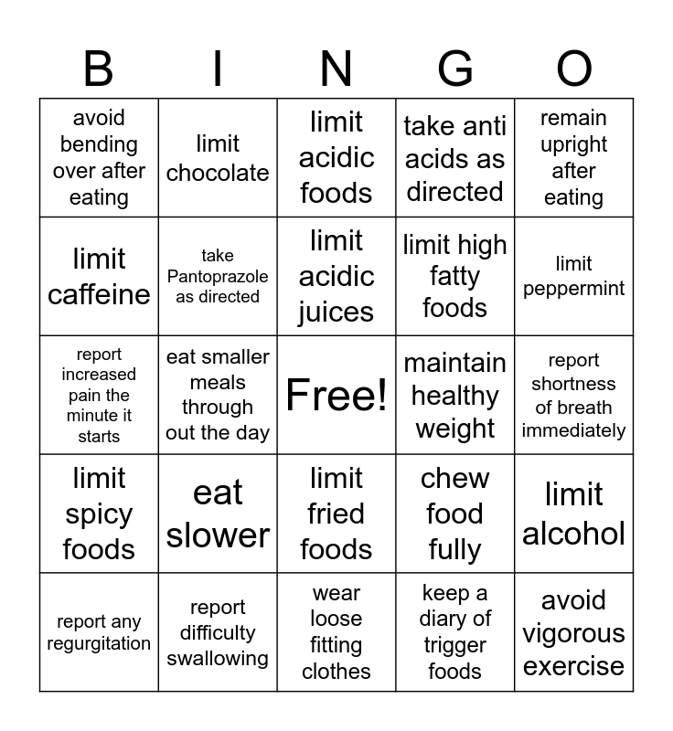 This bingo card has 1 images, a free space and 24 words: eat slower, report difficulty swallowing, limit acidic juices, report any regurgitation, remain upright after eating, avoid bending over after eating, limit caffeine, limit chocolate, maintain healthy weight, limit fried foods, limit high fatty foods, report increased pain the minute it starts, chew food fully, limit alcohol, take Pantoprazole as directed, keep a diary of trigger foods, report shortness of breath immediately, limit acidic foods, limit peppermint, eat smaller meals through out the day, avoid vigorous exercise, limit spicy foods, take anti acids as directed and wear loose fitting clothes.