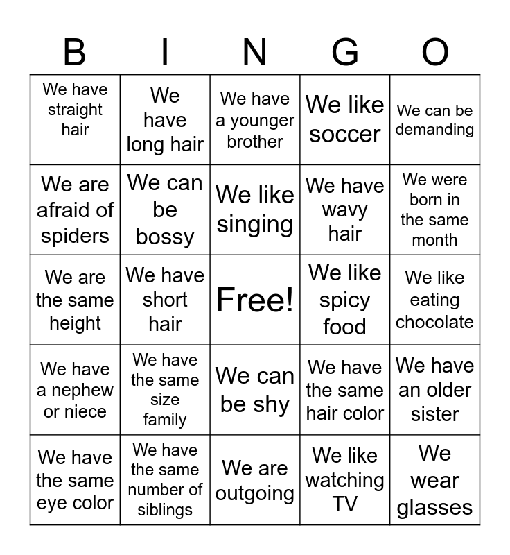 This bingo card has a free space and 27 words: We have the same hair color, We like cooking, We have wavy hair, We are outgoing, We are afraid of spiders, We have a younger brother, We have long hair, We have a nephew or niece, We like spicy food, We have an older sister, We are the same height, We like soccer, We have the same eye color, We have the same number of siblings, We were born in the same month, We have traveled to different states in the USA, We can be bossy, We like singing, We have the same size family, We have straight hair, We like eating chocolate, We like watching TV, We have short hair, We wear glasses, We can be shy, We can be demanding and We can be supportive.