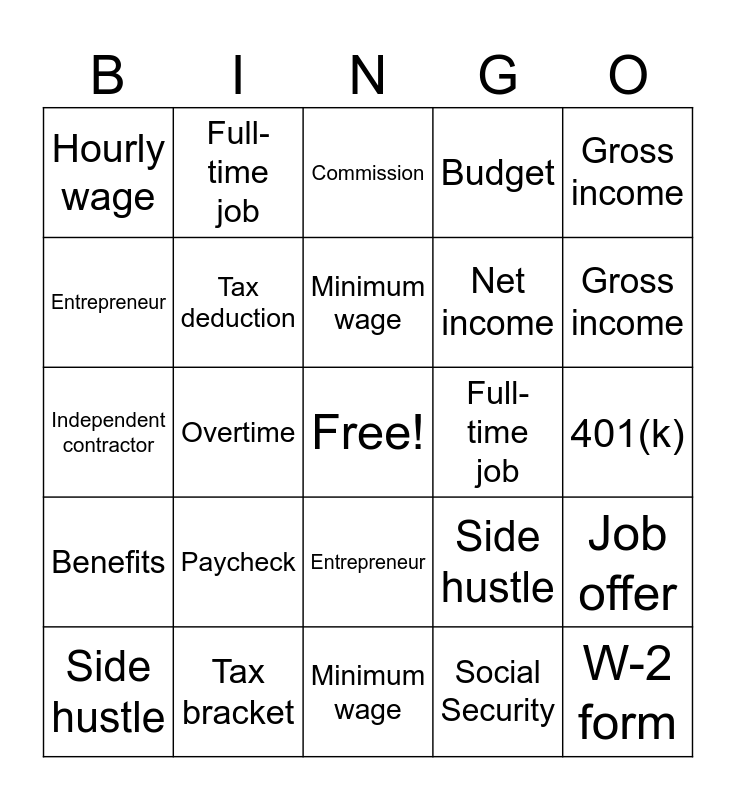 This bingo card has a free space and 39 words: Paycheck, Salary, Hourly wage, Tax deduction, Side hustle, Entrepreneur, Minimum wage, Net income, Gross income, Benefits, Overtime, Budget, W-2 form, 401(k), Full-time job, Paycheck, Salary, Hourly wage, Tax deduction, Side hustle, Entrepreneur, Minimum wage, Net income, Gross income, Benefits, Overtime, Budget, W-2 form, 401(k), Full-time job, Part-time job, Freelance, Commission, Tax bracket, Social Security, Workweek, Job offer, Independent contractor and Job promotion.