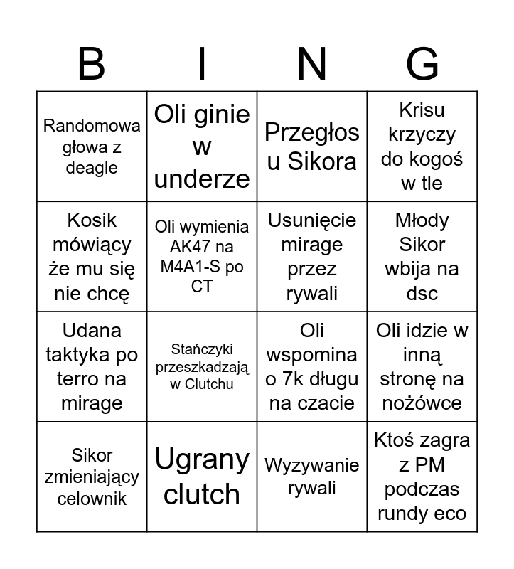 This bingo card has 16 words: Ugrany clutch, Oli idzie w inną stronę na nożówce, Przegłos u Sikora, Randomowa głowa z deagle, Udana taktyka po terro na mirage, Oli ginie w underze, Oli wspomina o 7k długu na czacie, Wyzywanie rywali, Kosik mówiący że mu się nie chcę, Oli wymienia AK47 na M4A1-S po CT, Sikor zmieniający celownik, Krisu krzyczy do kogoś w tle, Stańczyki przeszkadzają w Clutchu, Młody Sikor wbija na dsc, Usunięcie mirage przez rywali and Ktoś zagra z PM podczas rundy eco.