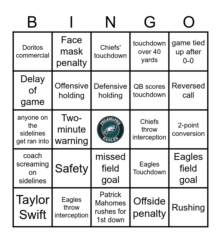 This bingo card has a free space and 69 words: Celebrity crowd shot, 2-point conversion, end of quarter, any team reaches 20+ points, Eagles throw interception, Chiefs field goal, touchdown over 40 yards, any team goes for 4th down, game tied up after 0-0, defensive touchdown, Eagles field goal, End zones dance, Doritos commercial, Chiefs' touchdown, QB Sneak, Two-minute warning, missed field goal, QB scores touchdown, false start penalty, coach screaming on sidelines, Chiefs throw interception, Eagles Touchdown, Reversed call, Offsides, Two-point Conversion, Trick Play, Half time, Touchdown over 40 yards, Offside penalty, Fumble, Face mask penalty, Quarterback Sack, Call Challenged, Missed field goal, Passing touchdown, Unnecessary roughness, Flag, interception, Delay of game, 4th down conversion, Safety, Rushing, Tied Game, Blocked Kick, Defensive Holding, Taylor Swift, Travis Kelsey, Dog in commercial, Intentional grounding, Offensive holding, Defensive holding, Pass interference, Player Tantrum/yelling, Patrick Mahomes rushes for 1st down, Kareem Hunt 20+ yards completion, Challenged play by a coach, personal foul, one handed catch, Shirtless Fan with Body paint, anyone on the sidelines get ran into, car commercial, Bud commercial, Jalen Hurts rush for 1st down, time out call, 10-yard penalty, Cheerleader close-up, Coach yelling at official, Owner of a team on camera and Kendrick Lamar on camera.