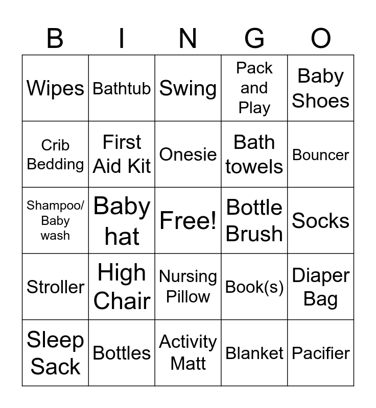 This bingo card has a free space and 24 words: High Chair, Bottles, Onesie, Sleep Sack, Baby Shoes, Wipes, Crib Bedding, Bathtub, Bottle Brush, Nursing Pillow, Bath towels, Shampoo/ Baby wash, Book(s), Diaper Bag, First Aid Kit, Blanket, Socks, Swing, Bouncer, Baby hat, Pacifier, Stroller, Pack and Play and Activity Matt.