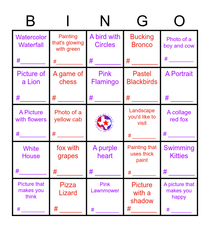 This bingo card has a free space and 24 words: Picture that makes you think # ________, fox with grapes #_______, Pink Flamingo # _______, Picture with a shadow #_______, Photo of a boy and cow # ________, Watercolor Waterfall #_______, Painting that's glowing with green #_________, A bird with Circles # _______, Landscape you'd like to visit # ________, A collage red fox # ________, A Picture with flowers #________, A game of chess # _______, Painting that uses thick paint # ________, Swimming Kitties # _______, Picture of a Lion #_______, Pizza Lizard # ______, Pink Lawnmower # ________, Bucking Bronco # _______, A Portrait # ______, White House #________, Photo of a yellow cab # ________, A purple heart # _______, Pastel Blackbirds # _______ and A picture that makes you happy # _______.