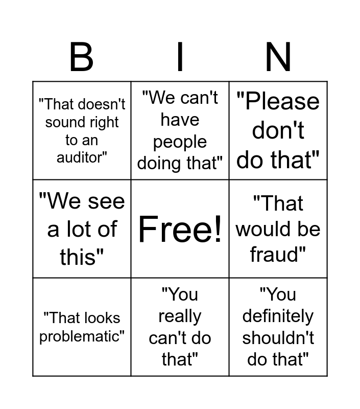 This bingo card has a free space and 8 words: "That would be fraud", "Please don't do that", "We can't have people doing that", "That looks problematic", "That doesn't sound right to an auditor", "You definitely shouldn't do that", "We see a lot of this" and "You really can't do that".