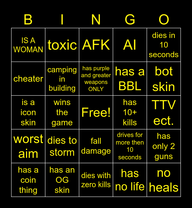 This bingo card has a free space and 24 words: dies to storm, has an OG skin, has purple and greater weapons ONLY, has a coin thing, dies in 10 seconds, IS A WOMAN, cheater, toxic, has 10+ kills, fall damage, has a BBL, is a icon skin, drives for more then 10 seconds, has only 2 guns, camping in building, has no life, TTV ect., AFK, bot skin, wins the game, no heals, worst aim, AI and dies with zero kills.