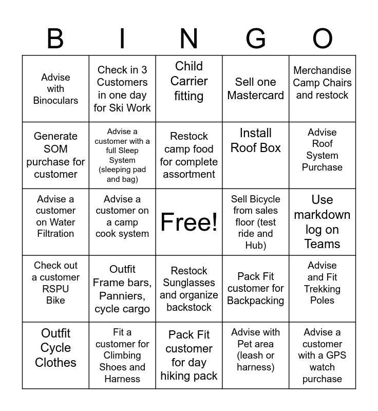 This bingo card has a free space and 25 words: Outfit Cycle Clothes, Outfit Frame bars, Panniers, cycle cargo, Restock camp food for complete assortment, Advise with Pet area (leash or harness), Advise Roof System Purchase, Advise with Binoculars, Check in 3 Customers in one day for Ski Work, Child Carrier fitting, Install Roof Box, Advise and Fit Trekking Poles, Advise a customer on Water Filtration, Advise a customer with a full Sleep System (sleeping pad and bag), Pack Fit customer for Backpacking, Advise a customer with a GPS watch purchase, Generate SOM purchase for customer, Fit a customer for Climbing Shoes and Harness, Pack Fit customer for day hiking pack, Sell one Mastercard, Use markdown log on Teams, Check out a customer RSPU Bike, Advise a customer on a camp cook system, Restock Sunglasses and organize backstock, Sell Bicycle from sales floor (test ride and Hub), Merchandise Camp Chairs and restock and Membership Hat Trick (3) in one day.