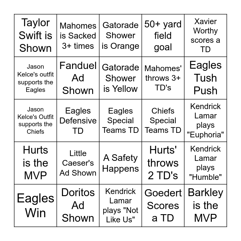 This bingo card has 55 words: Chiefs Win, Eagles Win, Travis Kelce Scores, Taylor Swift is Shown, Kendrick Lamar plays "Not Like Us", Budweiser Ad Shown, Fanduel Ad Shown, Hurts runs for a TD, Mahomes' throws 3+ TD's, Mahomes' throws an INT, 50+ yard field goal, Streaker on the field, Coin toss is heads, Coin Toss is tails, Barkley scores a TD, AJ Brown Scores a TD, Xavier Worthy scores a TD, Eagles Defensive TD, Chiefs Defensive TD, Eagles Special Teams TD, Chiefs Special Teams TD, Walk off Field goal to win it, Hurts' throws 2 TD's, Gatorade Shower is Orange, Gatorade Shower is Blue, Gatorade Shower is Yellow, Goedert Scores a TD, Kareem Hunt Scores a TD, Kendrick Lamar plays "Euphoria", Kendrick Lamar plays "Humble", Kendrick Lamar brings out, Travis Kelce proposes to Taylor Swift, Kendrick Lamar brings out Baby Keem, Kendrick Lamar brings out Drake, Jason Kelce's outfit supports the Eagles, Jason Kelce's Outfit supports the Chiefs, Mahomes is the MVP, Hurts is the MVP, Barkley is the MVP, NERDS Ad Shown, Mahomes is Sacked 3+ times, Hurts is Sacked 3+ times, Blocked Kick, Jeep Ad Shown, Little Caeser's Ad Shown, Doritos Ad Shown, Kia Ad Shown, Trick Play Happens, 2-Point Conversion, Eagles Tush Push, Taco Bell Ad Shown, Squarespace Ad Shown, Nike Ad Shown, A Safety Happens and TD gets Overturned.