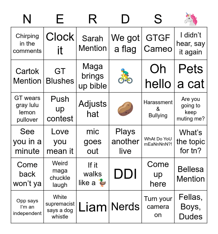 This bingo card has 36 words: DDI, If it walks like a 🦆, Nerds, Cartok Mention, See you in a minute, 🥔, GT Blushes, Liam, GTGF Cameo, Come up here, Pets a cat, We got a flag, Bellesa Mention, Push up contest, 🚴♂️, Chirping in the comments, Come back won’t ya, Harassment & Bullying, GT wears gray lulu lemon pullover, Sarah Mention, Adjusts hat, Love you mean it, Plays another live, mic goes out, WhAt Do YoU mEaNnNnN?!, Clock it, Oh hello, White supremacist says a dog whistle, Maga brings up bible, I didn’t hear, say it again, Fellas, Boys, Dudes, Opp says I’m an independent, What’s the topic for tn?, Are you going to keep muting me?, Weird maga chuckle laugh and Turn your camera on.