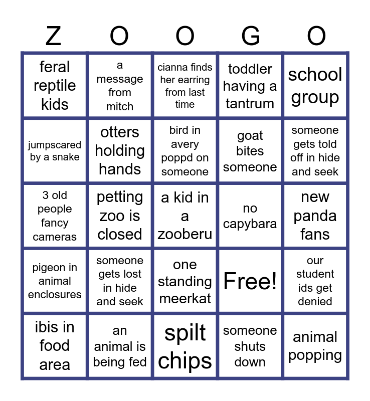 This bingo card has 25 words: someone gets lost in hide and seek, spilt chips, bird in avery poppd on someone, ibis in food area, school group, feral reptile kids, jumpscared by a snake, a message from mitch, no capybara, one standing meerkat, goat bites someone, 3 old people fancy cameras, Free!, our student ids get denied, otters holding hands, animal popping, new panda fans, cianna finds her earring from last time, someone gets told off in hide and seek, petting zoo is closed, a kid in a zooberu, an animal is being fed, pigeon in animal enclosures, toddler having a tantrum and someone shuts down.