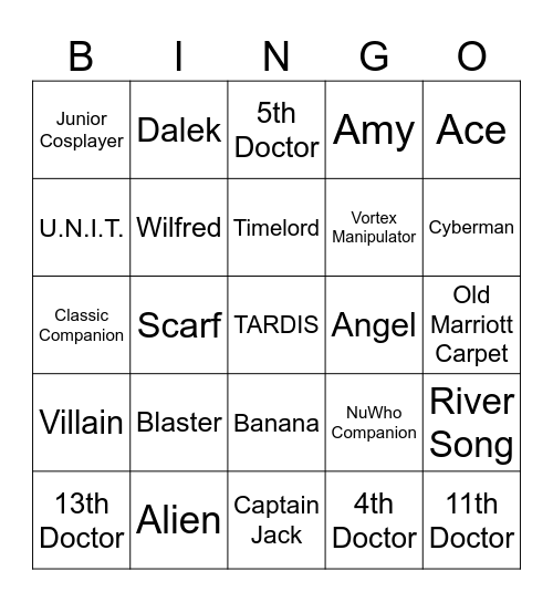 This bingo card has a free space and 45 words: 10th/14th Doctor, 11th Doctor, 12th Doctor, 13th Doctor, 15th Doctor, 4th Doctor, 5th Doctor, 9th Doctor, Ace, Alien, Amy, Angel, Banana, Blaster, Bowtie, Captain Jack, Clara, Classic Companion, Classic Doctor, Cyberman, Dalek, Donna, Fez, Junior Cosplayer, K-9, Old Marriott Carpet, Master/Missy, Kerblam, NuWho Companion, Villain, Psychic Paper, River Song, Ruby, Rose, Sarah Jane, Scarf, Sister of Karn, Sonic Screwdriver, Space Suit, Timelord, U.N.I.T., Vortex Manipulator, Union Jack, Wilfred and Your Favorite Staff Member.