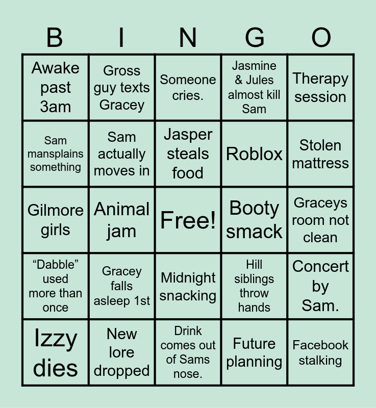 This bingo card has a free space and 24 words: Gracey falls asleep 1st, New lore dropped, Jasper steals food, Izzy dies, Therapy session, Awake past 3am, Sam mansplains something, Gross guy texts Gracey, Booty smack, Midnight snacking, Roblox, Gilmore girls, Hill siblings throw hands, Concert by Sam., Sam actually moves in, Future planning, Graceys room not clean, Someone cries., Stolen mattress, Animal jam, Facebook stalking, “Dabble” used more than once, Jasmine & Jules almost kill Sam and Drink comes out of Sams nose..