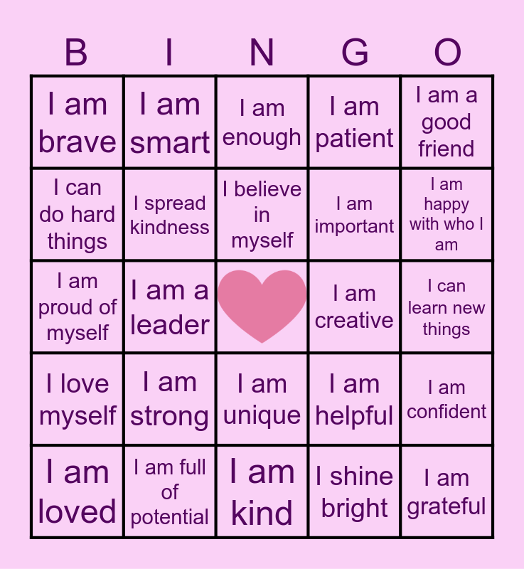This bingo card has a free space and 25 words: I am strong, I am kind, I believe in myself, I am loved, I am a good friend, I am brave, I can do hard things, I am smart, I am creative, I am unique, I am important, I am proud of myself, I am helpful, I am confident, I spread kindness, I make a difference, I can learn new things, I am enough, I am happy with who I am, I am a leader, I am grateful, I am full of potential, I love myself, I am patient and I shine bright.
