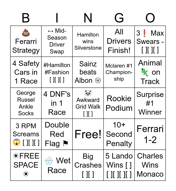 This bingo card has 26 words: Free!, 5 Lando Wins [ ] [ ][ ][ ][ ], Sainz beats Albon β¦, π§ Wet Race, 3β Max Swears - [ ][ ][ ], π© Ferarri Strategy, 4 Safety Cars in 1 Race, β Mid-Season Driver Swap, Surprise #1 Winner, 10+ Second Penalty, Mclaren #1 Champion-ship, George Russel Ankle Socks, Ferrari 1-2, βFREE SPACEβ, 4 DNF's in 1 Race, Stroll being a Window πͺ Licker, All Drivers Finish!, 3 RPM Screams π± [ ][ ][ ], Hamilton wins Silverstone, πΌ Awkward Grid Walk [ ][ ], Animal π¦ on Track, Big Crashes [ ][ ], Rookie Podium, Double Red Flag β, #Hamilton #Fashion [ ][ ][ ] and Charles Wins Monaco.