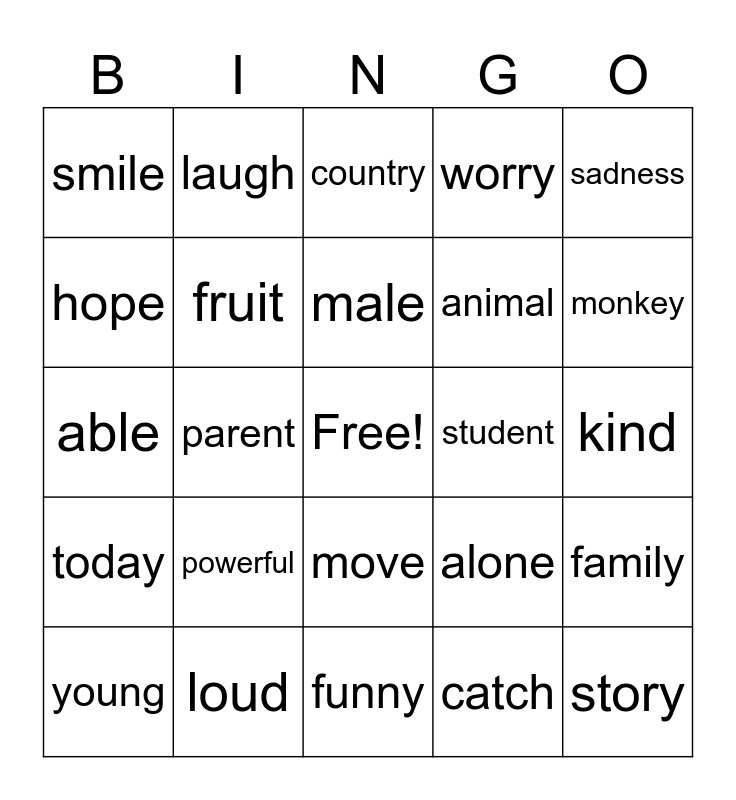 This bingo card has a free space and 24 words: powerful, loud, male, young, sadness, smile, hope, laugh, student, move, animal, able, alone, family, fruit, catch, kind, country, monkey, parent, story, today, worry and funny.