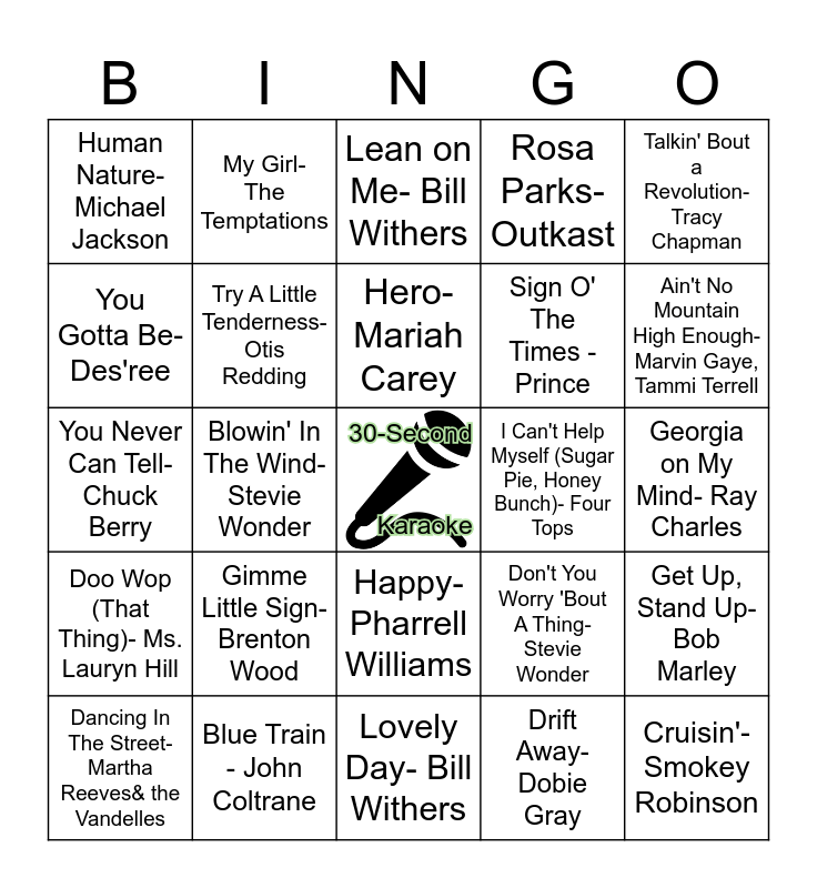 This bingo card has a free space and 38 words: Respect- Aretha Franklin, Love Come Down- Evelyn King, What's Going On- Mavin Gaye, Try A Little Tenderness- Otis Redding, Get Up, Stand Up- Bob Marley, Gimme Little Sign- Brenton Wood, Hero- Mariah Carey, A Change Is Gonna Come- Sam Cooke, Talkin' Bout a Revolution- Tracy Chapman, Sign O' The Times - Prince, Blowin' In The Wind- Stevie Wonder, Rosa Parks- Outkast, Cruisin'- Smokey Robinson, Georgia on My Mind- Ray Charles, You Gotta Be- Des'ree, Doo Wop (That Thing)- Ms. Lauryn Hill, I Will Survive- Gloria Gaynor, Lean on Me- Bill Withers, I Can See Clearly Now- Johnny Nash, I Can't Help Myself (Sugar Pie, Honey Bunch)- Four Tops, Human Nature- Michael Jackson, Blue Train - John Coltrane, Ain't No Mountain High Enough- Marvin Gaye, Tammi Terrell, Dancing In The Street- Martha Reeves& the Vandelles, Sir Duke- Stevie Wonder, Lovely Day- Bill Withers, What A Wonderful World- Louis Armstrong, Blame It on the Boogie- The Jacksons, (Sittin' On) the Dock of the Bay- Otis Redding, Jump in the Line- Harry Belafonte, Build Me Up Buttercup- The Foundations, Happy- Pharrell Williams, Drift Away- Dobie Gray, My Girl- The Temptations, Ease On Down The Road #1- Diana R & Michael, Don't You Worry 'Bout A Thing- Stevie Wonder, You Never Can Tell- Chuck Berry and What's Love Got To Do With It- Tina Turner.