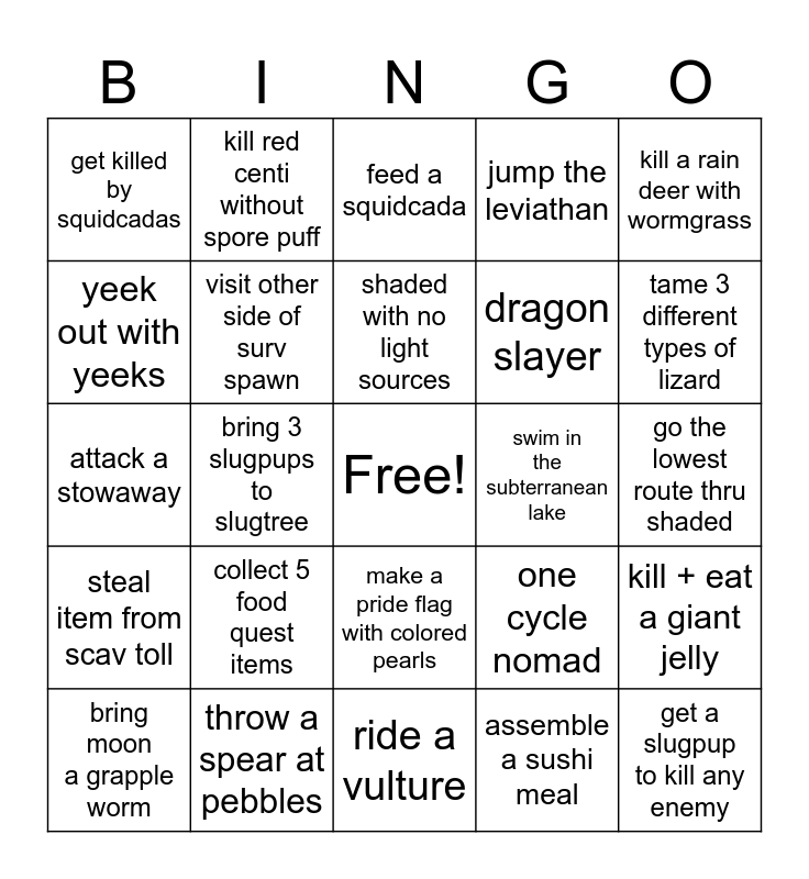 This bingo card has a free space and 24 words: collect 5 food quest items, throw a spear at pebbles, shaded with no light sources, bring moon a grapple worm, kill a rain deer with wormgrass, get killed by squidcadas, yeek out with yeeks, kill red centi without spore puff, swim in the subterranean lake, make a pride flag with colored pearls, dragon slayer, attack a stowaway, one cycle nomad, kill + eat a giant jelly, visit other side of surv spawn, assemble a sushi meal, go the lowest route thru shaded, feed a squidcada, tame 3 different types of lizard, bring 3 slugpups to slugtree, get a slugpup to kill any enemy, steal item from scav toll, jump the leviathan and ride a vulture.