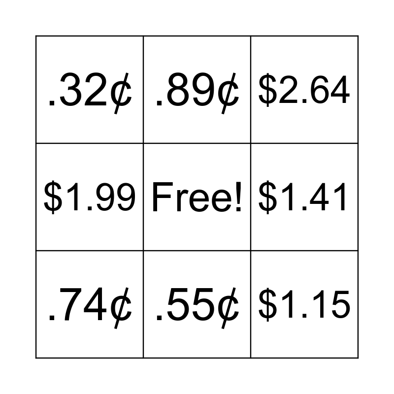This bingo card has a free space and 8 words: $1.99, .89¢, $1.41, .74¢, $2.64, .32¢, .55¢ and $1.15.