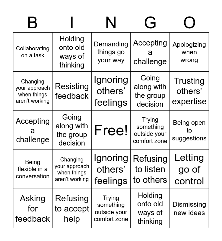This bingo card has a free space and 59 words: Willing to try something new, Refusing to accept help, Trying a different method, Being flexible in a conversation, Holding onto old ways of thinking, Listening to someone’s opinion, Resisting feedback, Admitting you don’t know something, Going along with the group decision, Stubbornly insisting you’re right, Accepting a challenge, Avoiding uncomfortable situations, Changing your approach when things aren’t working, Being open to suggestions, Fighting change, Collaborating on a task, Dismissing new ideas, Apologizing when wrong, Adapting to a new routine, Ignoring others’ feelings, Trying something outside your comfort zone, Demanding things go your way, Asking for feedback, Letting go of control, Resisting compromise, Being willing to change your mind, Refusing to listen to others, Being open to new experiences, Trusting others’ expertise, Refusing to ask for help, Willing to try something new, Refusing to accept help, Trying a different method, Being flexible in a conversation, Holding onto old ways of thinking, Listening to someone’s opinion, Admitting you don’t know something, Going along with the group decision, Stubbornly insisting you’re right, Accepting a challenge, Avoiding uncomfortable situations, Changing your approach when things aren’t working, Being open to suggestions, Fighting change, Collaborating on a task, Dismissing new ideas, Apologizing when wrong, Adapting to a new routine, Ignoring others’ feelings, Trying something outside your comfort zone, Demanding things go your way, Asking for feedback, Letting go of control, Resisting compromise, Being willing to change your mind, Refusing to listen to others, Being open to new experiences, Trusting others’ expertise and Refusing to ask for help.