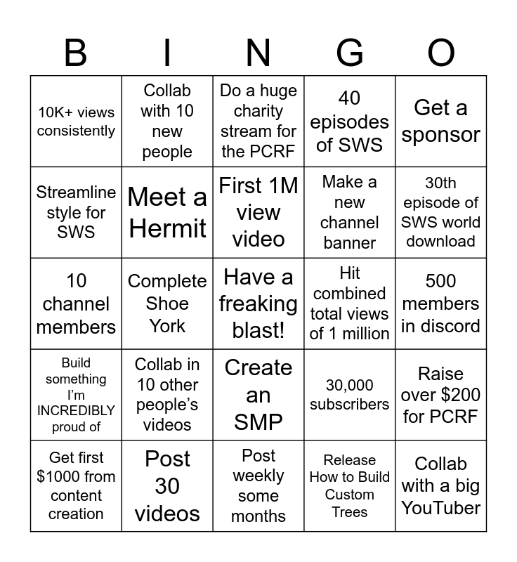 This bingo card has a free space and 24 words: Collab in 10 other people’s videos, Post 30 videos, First 1M view video, Get first $1000 from content creation, Get a sponsor, 10K+ views consistently, Streamline style for SWS, Collab with 10 new people, Hit combined total views of 1 million, Create an SMP, Make a new channel banner, 10 channel members, 30,000 subscribers, Raise over $200 for PCRF, Meet a Hermit, Release How to Build Custom Trees, 500 members in discord, Do a huge charity stream for the PCRF, 30th episode of SWS world download, Complete Shoe York, Collab with a big YouTuber, Build something I’m INCREDIBLY proud of, 40 episodes of SWS and Post weekly some months.