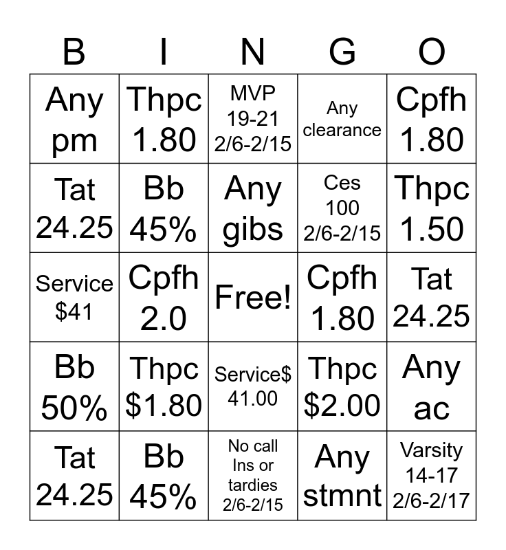 This bingo card has a free space and 24 words: Thpc $1.80, Bb 45%, Any gibs, Tat 24.25, Cpfh 1.80, Any pm, Tat 24.25, Thpc 1.80, Cpfh 1.80, Service$ 41.00, Ces 100 2/6-2/15, Service $41, Thpc $2.00, Any ac, Bb 45%, Any stmnt, Tat 24.25, MVP 19-21 2/6-2/15, Thpc 1.50, Cpfh 2.0, Varsity 14-17 2/6-2/17, Bb 50%, Any clearance and No call Ins or tardies 2/6-2/15.