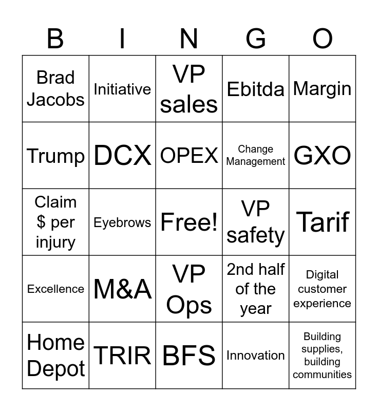 This bingo card has a free space and 37 words: Driving forward, Pivot, CI, DCX, Digital customer experience, M&A, OPEX, Budget, Margin, Gross sales, Eyebrows, Ebitda, Building supplies, building communities, Tarif, Trump, Excellence, Joe Rogan, VP sales, VP Ops, VP safety, Brad Jacobs, GXO, Home Depot, BFS, Basis points, Innovation, Initiative, Launched, Mortgage Interest Rates, Short of budget, 100th acquisition, TRIR, Claim $ per injury, 1st half of the year, 2nd half of the year, Change Management and Market optimization.