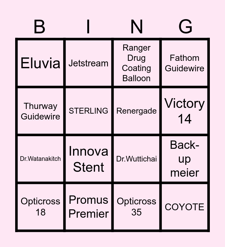 This bingo card has 37 words: Free!, Rubicon 14, Rubicon 18, Renergade, V-18, V-14, Victory 14, Victory 18, Thurway Guidewire, Amplatz Guidewire, Back-up meier, Fathom Guidewire, Opticross 18, Opticross 35, STERLING, COYOTE, MUSTANG, Ranger Drug Coating Balloon, Cutting Balloon, Promus Premier, Eluvia, Innova Stent, Express Vascular LD Stent, Wallstent, Carotid Wallstent, Epic Stent, Jetstream, Angiojet, Filter Wire EZ, Interlock Coil, Encore™ 26, Filter Wire EZ, Dr.Wuttichai, Dr.Wacharaphong, Dr.Chinapath, Dr.Watanakitch and Dr.Thitinai.
