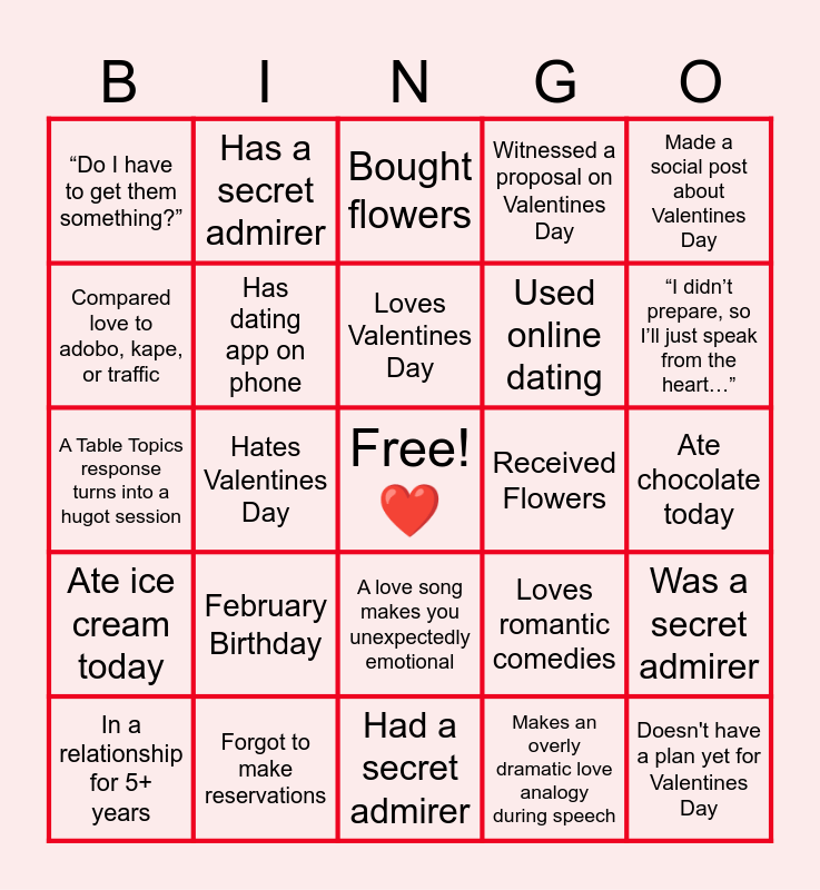 This bingo card has a free space and 24 words: February Birthday, Forgot to make reservations, Loves Valentines Day, In a relationship for 5+ years, Made a social post about Valentines Day, “Do I have to get them something?”, Compared love to adobo, kape, or traffic, Has a secret admirer, Received Flowers, A love song makes you unexpectedly emotional, Used online dating, A Table Topics response turns into a hugot session, Loves romantic comedies, Was a secret admirer, Has dating app on phone, Makes an overly dramatic love analogy during speech, Ate chocolate today, Bought flowers, “I didn’t prepare, so I’ll just speak from the heart…”, Hates Valentines Day, Doesn't have a plan yet for Valentines Day, Ate ice cream today, Witnessed a proposal on Valentines Day and Had a secret admirer.