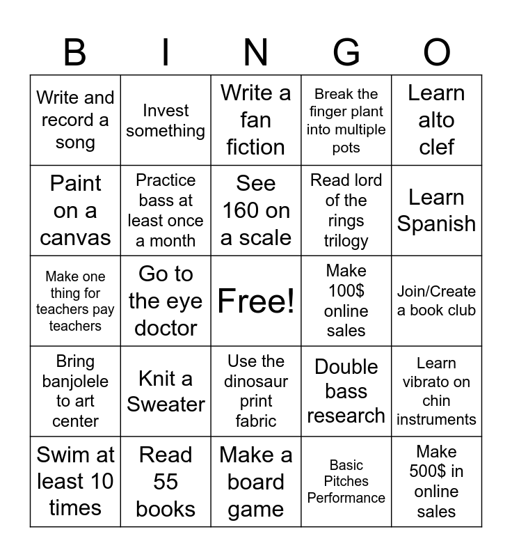 This bingo card has a free space and 24 words: Knit a Sweater, Read 55 books, See 160 on a scale, Swim at least 10 times, Learn alto clef, Write and record a song, Paint on a canvas, Invest something, Make 100$ online sales, Use the dinosaur print fabric, Read lord of the rings trilogy, Make one thing for teachers pay teachers, Double bass research, Learn vibrato on chin instruments, Practice bass at least once a month, Basic Pitches Performance, Join/Create a book club, Write a fan fiction, Learn Spanish, Go to the eye doctor, Make 500$ in online sales, Bring banjolele to art center, Break the finger plant into multiple pots and Make a board game.
