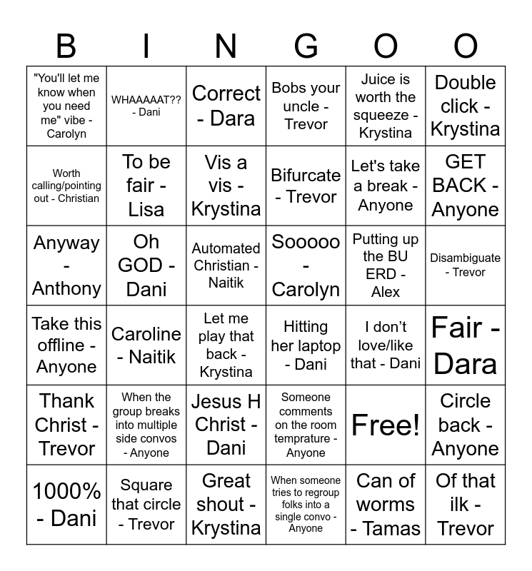 This bingo card has 37 words: Free!, Someone comments on the room temprature - Anyone, Can of worms - Tamas, Worth calling/pointing out - Christian, Caroline - Naitik, Putting up the BU ERD - Alex, To be fair - Lisa, When someone tries to regroup folks into a single convo - Anyone, Juice is worth the squeeze - Krystina, 1000% - Dani, GET BACK - Anyone, Bobs your uncle - Trevor, Anyway - Anthony, Automated Christian - Naitik, Double click - Krystina, Sooooo - Carolyn, When the group breaks into multiple side convos - Anyone, Correct - Dara, Disambiguate - Trevor, Oh GOD - Dani, "You'll let me know when you need me" vibe - Carolyn, Bifurcate - Trevor, Let me play that back - Krystina, I don’t love/like that - Dani, Square that circle - Trevor, Fair - Dara, WHAAAAAT?? - Dani, Great shout - Krystina, Circle back - Anyone, Jesus H Christ - Dani, Moves on from his own joke too quick - Anthony, Hitting her laptop - Dani, Let's take a break - Anyone, Thank Christ - Trevor, Take this offline - Anyone, Vis a vis - Krystina and Of that ilk - Trevor.