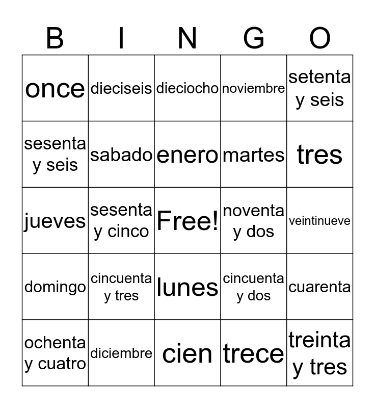 This bingo card has a free space and 24 words: cincuenta y tres, diciembre, enero, ochenta y cuatro, setenta y seis, once, sesenta y seis, dieciseis, noventa y dos, lunes, martes, jueves, cincuenta y dos, cuarenta, sabado, trece, veintinueve, dieciocho, tres, sesenta y cinco, treinta y tres, domingo, noviembre and cien.