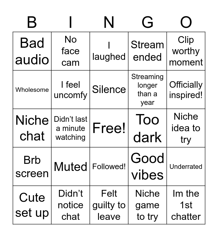 This bingo card has a free space and 24 words: Muted, Didn’t notice chat, Silence, Cute set up, Clip worthy moment, Bad audio, Wholesome, No face cam, Too dark, Followed!, Streaming longer than a year, Niche chat, Good vibes, Underrated, I feel uncomfy, Niche game to try, Niche idea to try, I laughed, Officially inspired!, Didn’t last a minute watching, Im the 1st chatter, Brb screen, Stream ended and Felt guilty to leave.