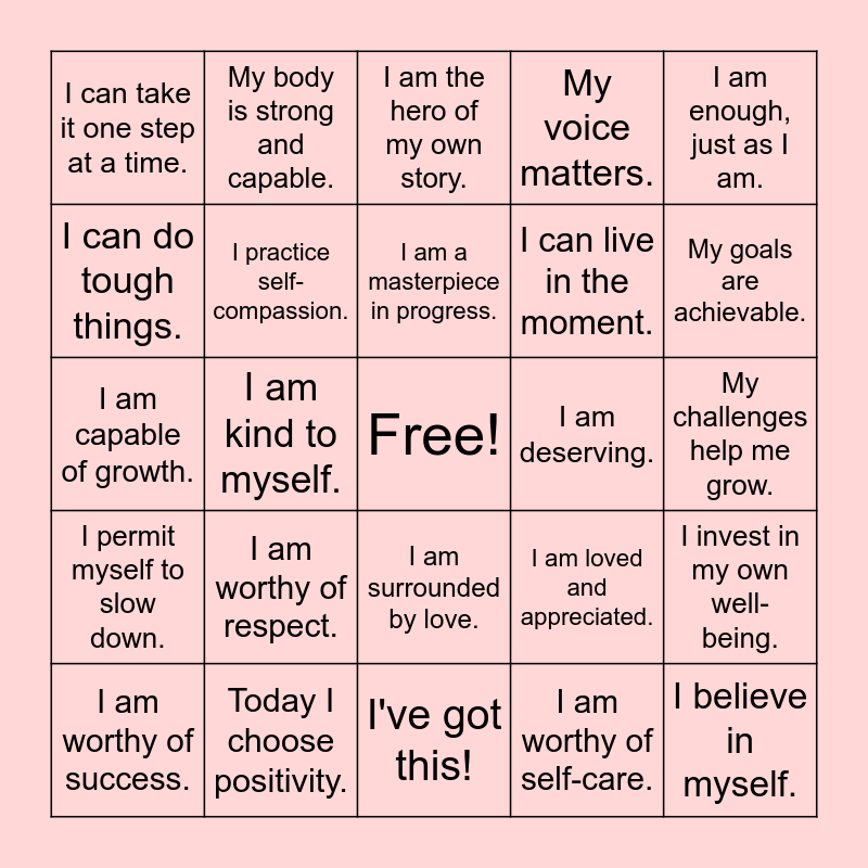 This bingo card has a free space and 32 words: I am worthy of self-care., My needs are important and valid., I am kind to myself., I nourish my mind, body, and soul., I permit myself to slow down., I practice self-compassion., I am enough, just as I am., I invest in my own well-being., My body is strong and capable., I listen to my body's needs., I am a masterpiece in progress., I am the hero of my own story., I am capable., I am grateful., I am deserving., I am resilient., I am worthy of success., I am capable of growth., I am surrounded by love., I am worthy of respect., I am loved and appreciated., I forgive myself for my mistakes., My challenges help me grow., Today I choose positivity., I believe in myself., My voice matters., I can live in the moment., I can do tough things., I can take it one step at a time., I've got this!, I use my coping skills when needed. and My goals are achievable..