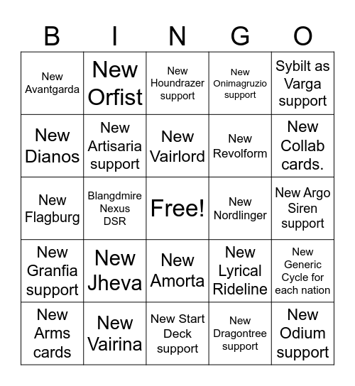 This bingo card has a free space and 24 words: New Jheva, New Vairina, New Vairlord, New Arms cards, Sybilt as Varga support, New Avantgarda, New Dianos, New Orfist, New Nordlinger, New Amorta, New Revolform, New Flagburg, New Lyrical Rideline, New Generic Cycle for each nation, New Artisaria support, New Dragontree support, New Argo Siren support, New Houndrazer support, New Collab cards., Blangdmire Nexus DSR, New Odium support, New Granfia support, New Onimagruzio support and New Start Deck support.