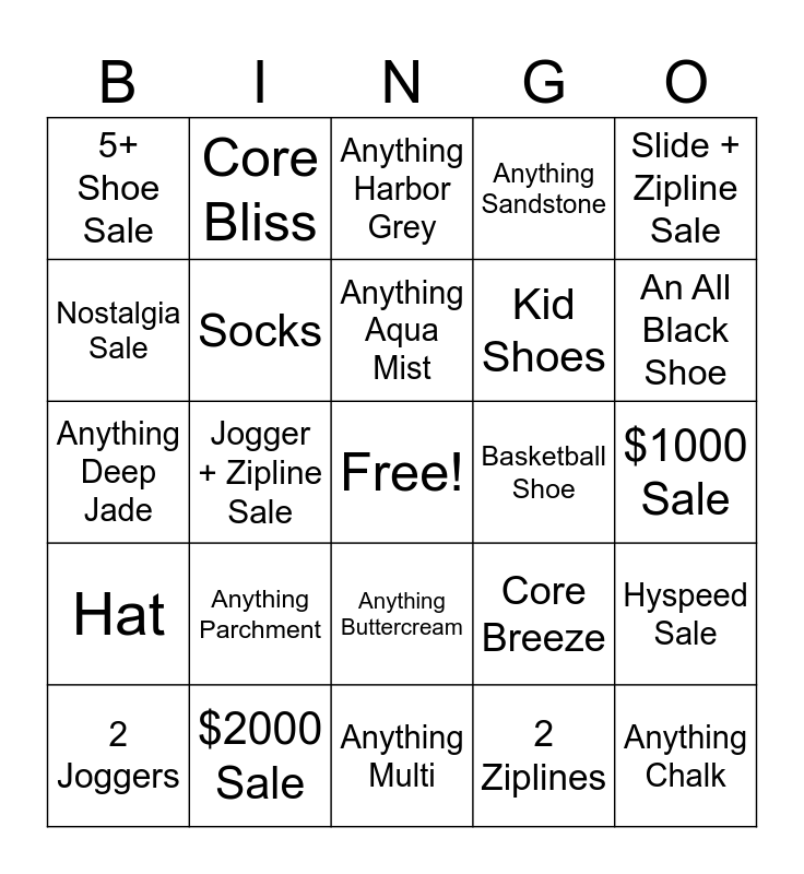 This bingo card has a free space and 24 words: Anything Parchment, $2000 Sale, Anything Aqua Mist, 2 Joggers, Slide + Zipline Sale, 5+ Shoe Sale, Nostalgia Sale, Core Bliss, Basketball Shoe, Anything Buttercream, Kid Shoes, Anything Deep Jade, Core Breeze, Hyspeed Sale, Socks, 2 Ziplines, $1000 Sale, Anything Harbor Grey, An All Black Shoe, Jogger + Zipline Sale, Anything Chalk, Hat, Anything Sandstone and Anything Multi.