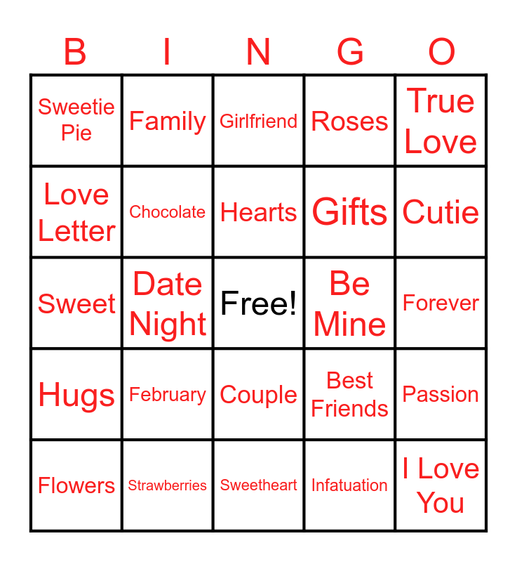 This bingo card has a free space and 39 words: Cupid, Love, Kisses, Chocolate, Flowers, Couple, Hearts, Candy, True Love, Hugs, Date Night, Roses, I Love You, Forever, Be Mine, February, My Boo, Sweetie Pie, Valentine, Best Friends, Love Letter, Sweetheart, Gifts, Cutie, Darling, Sugar, Dating, Cards, Date, Family, Pick Me, Flirting, Girlfriend, Strawberries, Infatuation, Secret Admirer, Passion, Sweet and Text Me.