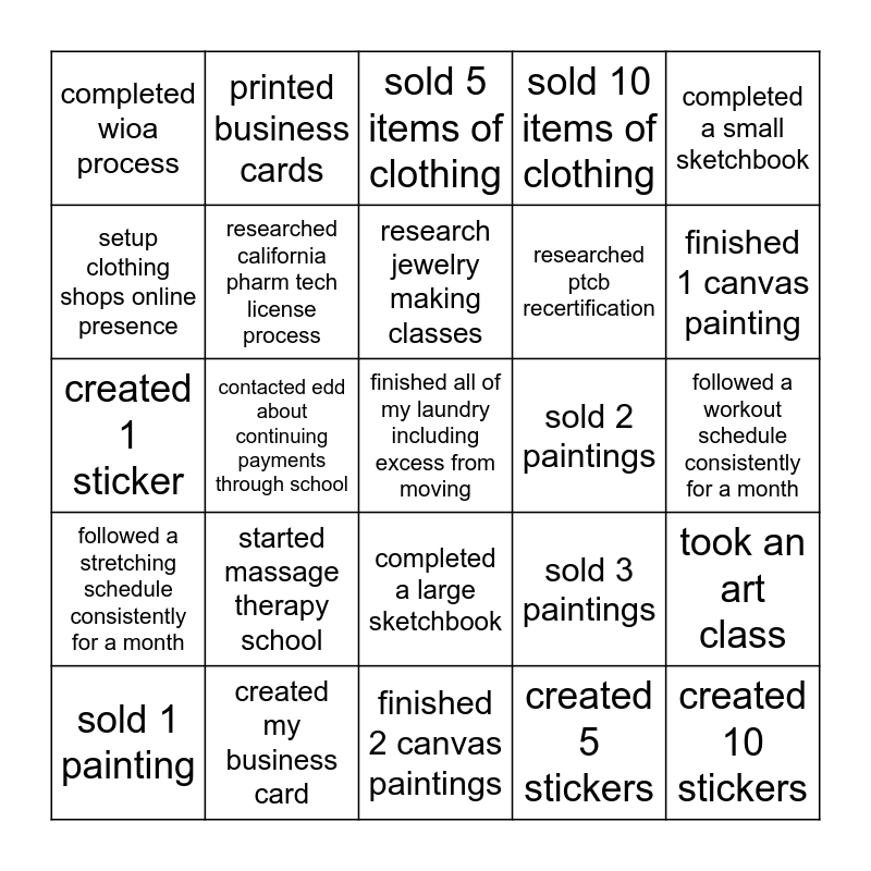 This bingo card has a free space and 24 words: started massage therapy school, created my business card, research jewelry making classes, sold 1 painting, completed a small sketchbook, completed wioa process, setup clothing shops online presence, printed business cards, sold 2 paintings, completed a large sketchbook, researched ptcb recertification, created 1 sticker, sold 3 paintings, took an art class, researched california pharm tech license process, created 5 stickers, followed a workout schedule consistently for a month, sold 5 items of clothing, finished 1 canvas painting, contacted edd about continuing payments through school, created 10 stickers, followed a stretching schedule consistently for a month, sold 10 items of clothing and finished 2 canvas paintings.