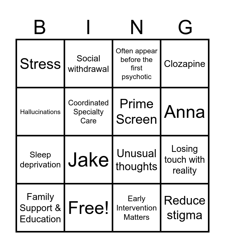 This bingo card has 16 words: Free!, Losing touch with reality, Often appear before the first psychotic, Stress, Sleep deprivation, Social withdrawal, Unusual thoughts, Early Intervention Matters, Hallucinations, Coordinated Specialty Care, Family Support & Education, Clozapine, Jake, Anna, Prime Screen and Reduce stigma.