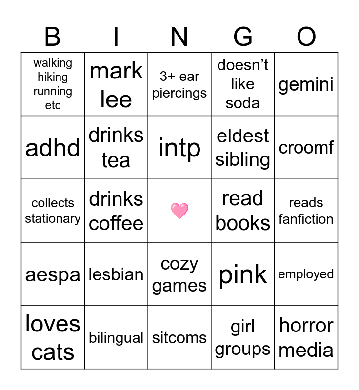 This bingo card has a free space and 24 words: lesbian, bilingual, intp, loves cats, gemini, walking hiking running etc, adhd, mark lee, read books, cozy games, eldest sibling, collects stationary, pink, employed, drinks tea, girl groups, reads fanfiction, 3+ ear piercings, croomf, drinks coffee, horror media, aespa, doesnβt like soda and sitcoms.