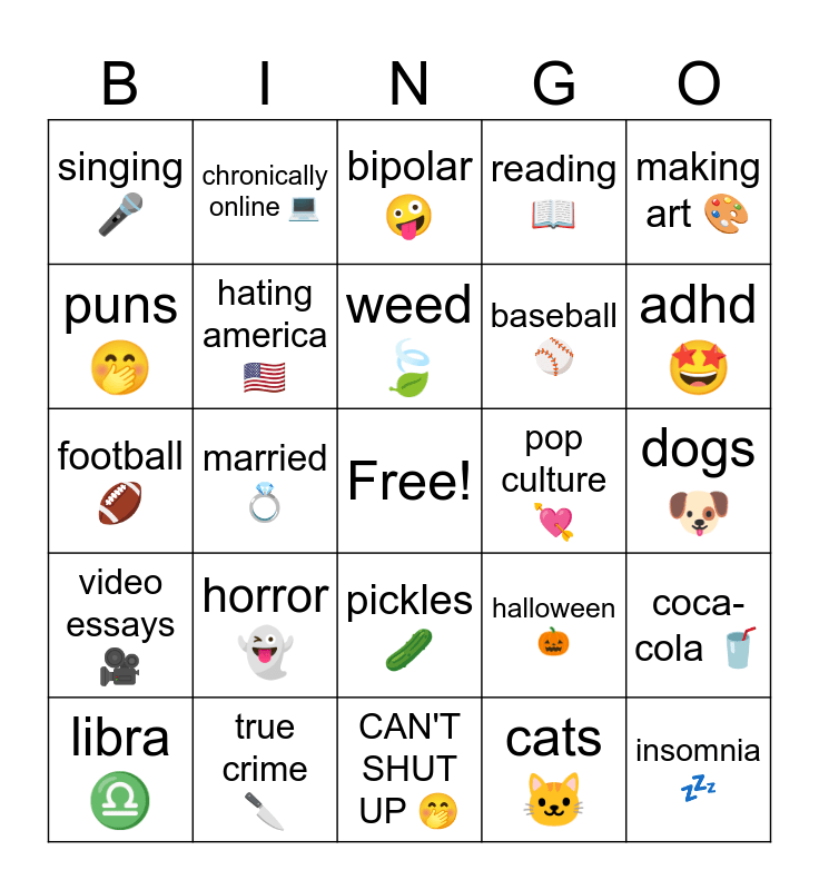 This bingo card has a free space and 24 words: horror π», true crime πͺ, weed π, libra βοΈ, making art π¨, singing π€, puns π€, chronically online π», pop culture π, pickles π₯, baseball βΎοΈ, football π, halloween π, coca-cola π₯€, hating america πΊπΈ, cats π±, dogs πΆ, bipolar π€ͺ, adhd π€©, married π, insomnia π€, video essays π₯, reading π and CAN'T SHUT UP π€.