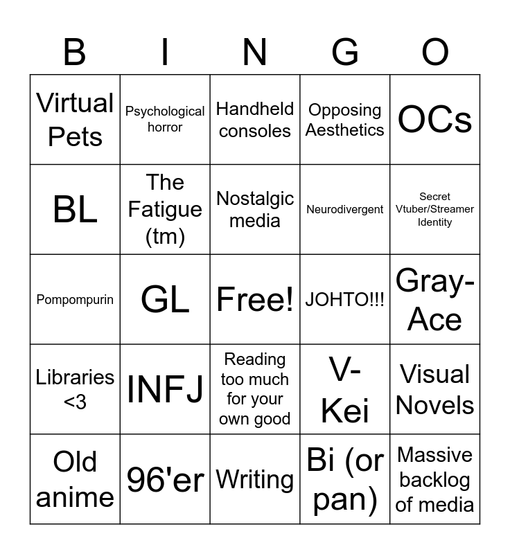 This bingo card has a free space and 24 words: INFJ, 96'er, Nostalgic media, Old anime, OCs, Virtual Pets, BL, Psychological horror, JOHTO!!!, Reading too much for your own good, Neurodivergent, Pompompurin, V-Kei, Visual Novels, The Fatigue (tm), Bi (or pan), Gray-Ace, Handheld consoles, Secret Vtuber/Streamer Identity, GL, Massive backlog of media, Libraries <3, Opposing Aesthetics and Writing.