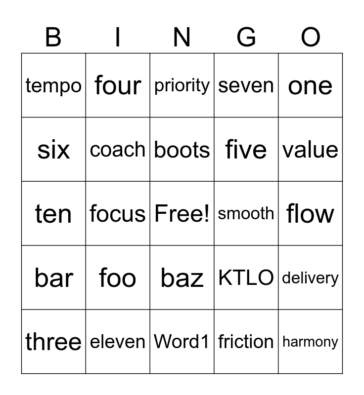 This bingo card has a free space and 31 words: Word1, Word2, focus, cadence, tempo, priority, coach, KTLO, smooth, friction, flow, harmony, leverage, manual, value, SLG, delivery, foo, bar, baz, one, two, three, four, five, six, seven, ten, eleven, boots and war.