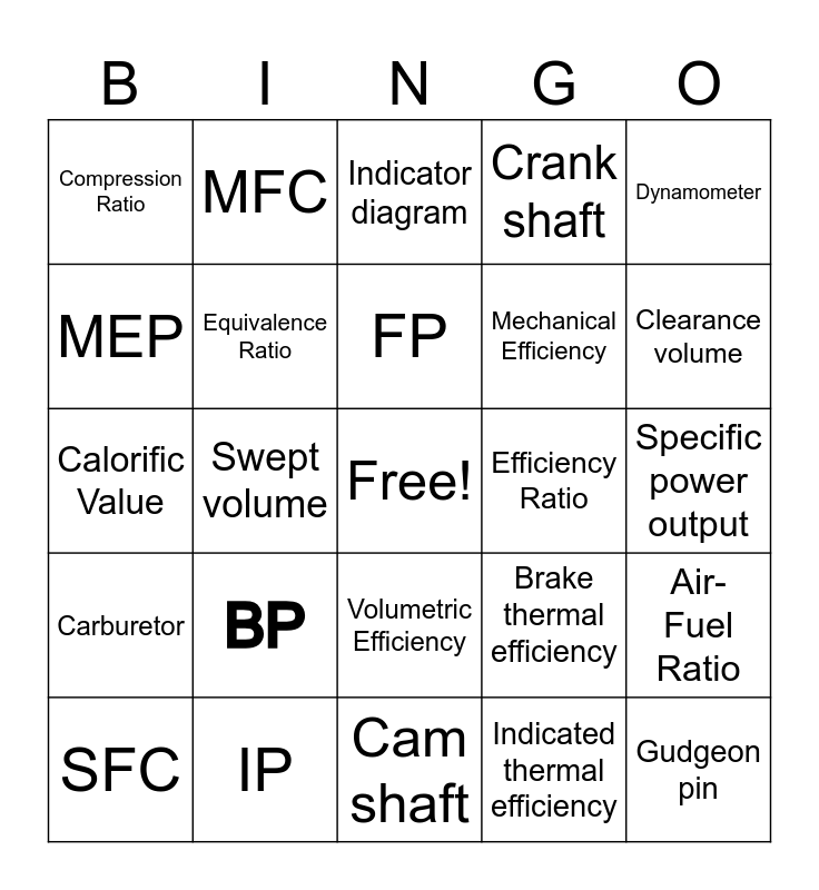 This bingo card has a free space and 24 words: BP, IP, FP, SFC, Dynamometer, Compression Ratio, MEP, MFC, Efficiency Ratio, Volumetric Efficiency, Mechanical Efficiency, Calorific Value, Brake thermal efficiency, Air-Fuel Ratio, Equivalence Ratio, Indicated thermal efficiency, Specific power output, Indicator diagram, Clearance volume, Swept volume, Gudgeon pin, Carburetor, Crank shaft and Cam shaft.