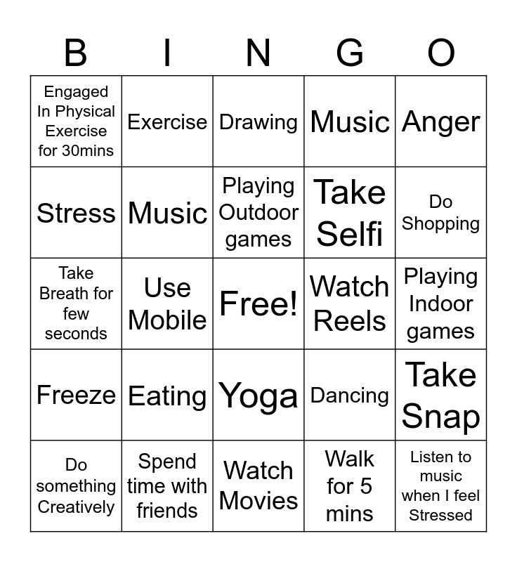 This bingo card has a free space and 29 words: Exercise, Spend time with friends, Drawing, Study, Anger, Engaged In Physical Exercise for 30mins, Music, Playing Outdoor games, Watch Reels, Take Snap, Do something Creatively, Use Mobile, Walk for 5 mins, Listen to music when I feel Stressed, Take Breath for few seconds, Spend time with family, Watch Movies, Dancing, Do Shopping, Freeze, Eating, Do Yoga, Take Selfi, Playing Indoor games, Stress, Exercise, Yoga, Music and Dancing.