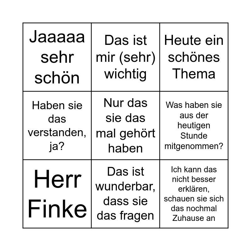This bingo card has 9 words: Herr Finke, Heute ein schönes Thema, Das ist mir (sehr) wichtig, Haben sie das verstanden, ja?, Jaaaaa sehr schön, Was haben sie aus der heutigen Stunde mitgenommen?, Nur das sie das mal gehört haben, Ich kann das nicht besser erklären, schauen sie sich das nochmal Zuhause an and Das ist wunderbar, dass sie das fragen.