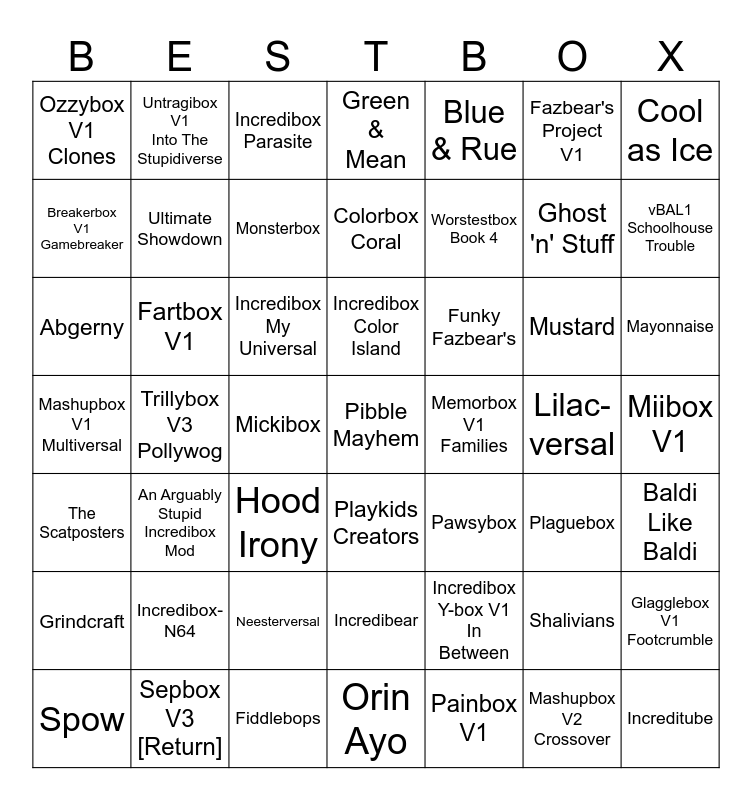 This bingo card has a free space and 48 words: The Scatposters, Trillybox V3 Pollywog, Fiddlebops, Playkids Creators, Worstestbox Book 4, Lilac-versal, Cool as Ice, Spow, Fartbox V1, Mickibox, Green & Mean, Blue & Rue, Mustard, Mayonnaise, Mashupbox V1 Multiversal, Incredibox-N64, Incredibox Parasite, Incredibox Color Island, Incredibox Y-box V1 In Between, Fazbear's Project V1, vBAL1 Schoolhouse Trouble, Breakerbox V1 Gamebreaker, Untragibox V1 Into The Stupidiverse, Monsterbox, Painbox V1, Ghost 'n' Stuff, Miibox V1, Grindcraft, An Arguably Stupid Incredibox Mod, Incredibox My Universal, Incredibear, Funky Fazbear's, Shalivians, Glagglebox V1 Footcrumble, Ozzybox V1 Clones, Sepbox V3 [Return], Hood Irony, Orin Ayo, Memorbox V1 Families, Mashupbox V2 Crossover, Baldi Like Baldi, Abgerny, Ultimate Showdown, Neesterversal, Colorbox Coral, Pawsybox, Plaguebox and Increditube.