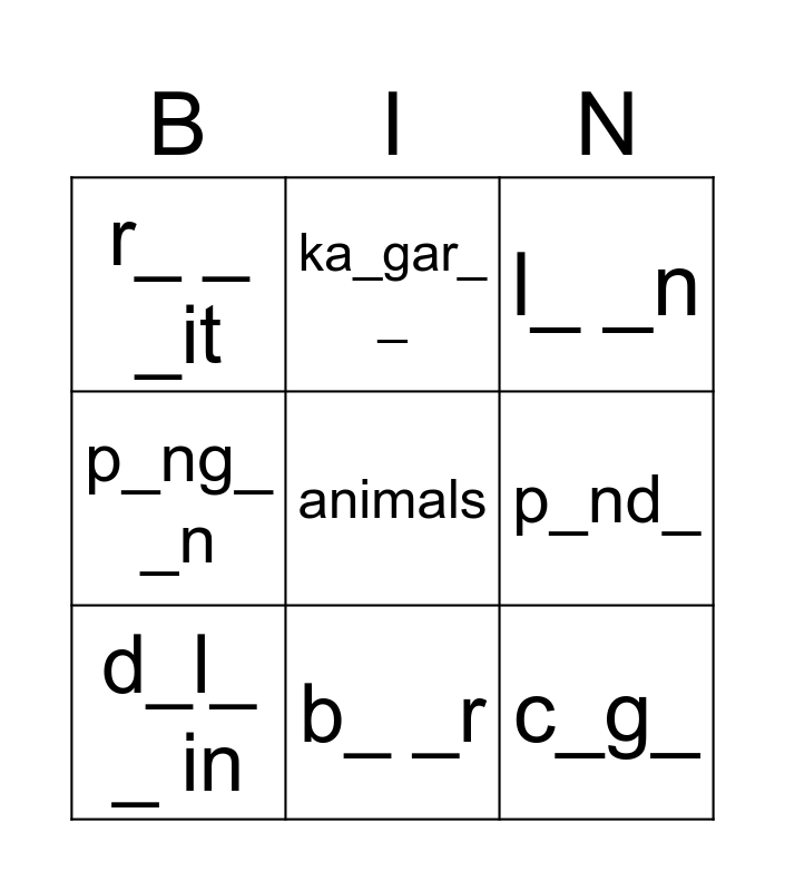 This bingo card has a free space and 11 words: b_t, b_ _r, c_g_, d_l_ _ in, ka_gar_ _, l_ _n, p_nd_, pa_ _ot, p_ng_ _n, r_ _ _it and w_ _l_.