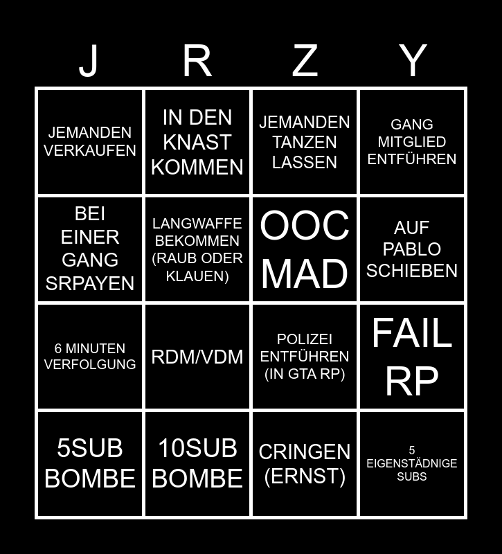 This bingo card has 16 words: 10SUB BOMBE, FAIL RP, JEMANDEN TANZEN LASSEN, JEMANDEN VERKAUFEN, 6 MINUTEN VERFOLGUNG, IN DEN KNAST KOMMEN, POLIZEI ENTFÜHREN (IN GTA RP), CRINGEN (ERNST), BEI EINER GANG SRPAYEN, LANGWAFFE BEKOMMEN (RAUB ODER KLAUEN), 5SUB BOMBE, GANG MITGLIED ENTFÜHREN, RDM/VDM, AUF PABLO SCHIEBEN, OOC MAD and 5 EIGENSTÄDNIGE SUBS.